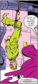 Shortly afterward, Cartland was annoyed by an "infernal racket" (actually the sounds of the Avengers battling more Pseudo-Hulks) which disturbed his concentration; he was suddenly shocked when Arnim Zola (who had transferred his mind into a giant purple blob, formed from the first Pseudo-Hulk's "living pants") seized him and demanded to know his identity. When Cartland explained who he was, Zola disdainfully exclaimed that he was just a nobody, then tied up Cartland and left him hanging upside-down from an overhead piece of equipment--the irate Cartland seemed to be more offended that Zola considered him to be "a nobody".