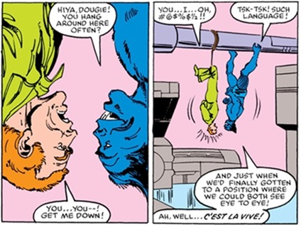 Avengers Annual I#13, p40, pan5, 7 ("Dougie" gets tormented by Beast's puns)