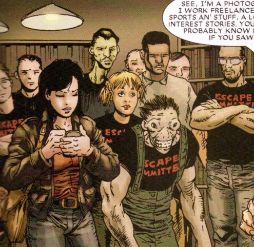 (Generation M#3 (fb) - BTS) - A group of former mutants who lost their powers on M-Day formed a support group to discuss their tragedies. They donned T-shirts that read “Escape Committee” and garnered a name for themselves.