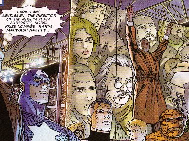 (Iron Man IV#10) - Najeeb arrived at the peace summit with several security agents, including SHIELD agents, the Avengers (Luke Cage, Captain America (Steve Rogers), Ms. Marvel (Carol Danvers), She-Hulk, Spider-Man (Peter Parker), Spider-Woman (Jessica Drew), Wolverine), and the Fantastic Four (Human Torch (Johnny Storm), Invisible Woman, Mr. Fantastic, Thing), stood by.