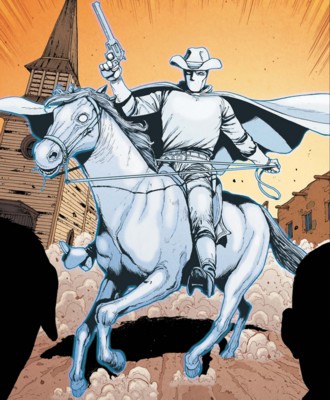 Powers/Abilities: The Phantom Rider was a superb hand-to-hand combatant, and former boxing champion in college. He was also an excellent horseman, and a fast and brilliantly accurate marksman with a gun. He used twin colt handguns and a lasso ("Lariat of the Night"). His costumes and weapons were covered with a phosphorescent dust which made them reflect and magnify light. The inside of his cape ("Cloak of Darkness" or "Cloak of Brightest Night") was solid black, enabling him to make it seem as though parts of his body had disappeared by concealing them within the cape. He also used a lantern ("Phantom Projector") which could project an image of himself, creating the illusion that he was a ghost. He also employed ventriloquism to throw his voice, further frightening his opponents. He rode a great white horse named Banshee, who had also been covered with the phosphorescent dust so that he would seem to be a ghostly steed.