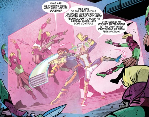 (Marvel Boy II#2 (fb) - BTS) - Star Splendor of the 18th Kree Diplomatic Gestalt stole the Pocket Battlefield from the Pink Pantheon after the Matter Fax malfunctioned and cloned the entire Macroverse. It was stored in the archive of the Marvel.