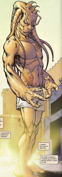 Powers/Abilities: After passing through the Terrigen mists, San shrank in size and mass and developed off-white skin, an elongated cranium with a series of tendrils coming from it, massive forearms with three clawed fingers, and strange red colorations on his skin. He developed the ability to channel his emotions into crystal-like art-forms, with a shelf-life of up to several days. These art-forms appear at various sizes. The extent of San's abilities remains unrevealed.