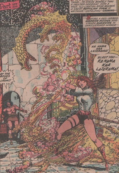 (Conan the Barbarian I#24) - Red Sonja led Conan into the royal palace of Makkalet, not telling him what she was looking for. They split up, and Sonja located the Tiara; entranced by its life-like beauty, she grabbed the Tiara and prepared to abscond with it, forgetting to first speak the words she had been told. The Tiara then came to life, transforming into a monstrous golden serpent. Sonja recalled the words and voiced them to no avail at that point. Sonja screamed and Conan rushed to the rescue, but he was swiftly wrapped in its coils. Sonja distracted the serpent and Conan smashed it in the face with a full treasure chest, paining it and gaining his freedom. It swiftly recovered and targeted Sonja again, but Conan leapt atop its head and drove his sword into it down to the hilt. The serpent's death-throes smashed Conan into the ceiling and then back into the large heap of gold below, but then it turned back into the Tiara. Speaking, "Ka Nama Kaa Lajerama," Sonja reclaimed the Tiara and she and Conan fled the castle, though Sonja then abandoned him, taking the Tiara with her.