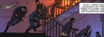 (New Avengers: “Pot of Gold” ) - Tango, who was needing funding for his group, was approached by Wilson Fisk, the Kingpin, and was given a powerful suit of armor so that he could break into the vault belonging to the AAFES that contained a quarter of a billion dollars. The Kingpin told him that there was a bomb implanted inside the armor and that if he double-crossed him, it would detonate. Unafraid to die, he agreed to assault the complex that held the money as his terrorist groups needed funding and the Kingpin promised to funnel some of the proceeds to various places anonymously.