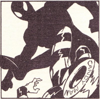 The art here, from page 85 of Emerald Mystery, is the only time that he appears to have been drawn; please do note that the displayed art is black-and-white, but Candy Man is not. The Life Saver-ish thing seen in the picture is not part of the costume, but one of the hard candy sweets that one of his weapons fires. As described in Emerald Mystery, Candy Man wears a bright red and white striped costume and a striped hood.