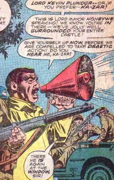 (Daredevil I#24 (fb) – BTS) – Lord Mayor Honeywell responded to a crime spree in London striking many homes, and the culprit called himself the Midnight Stalker. When he discovered bare footprints and tiger tracks, he assumed the culprit was Ka-Zar and his tiger Zabu, who'd recently moved into the Plunder estate. He and his men surrounded the house for hours, waiting for Ka-Zar to surrender.