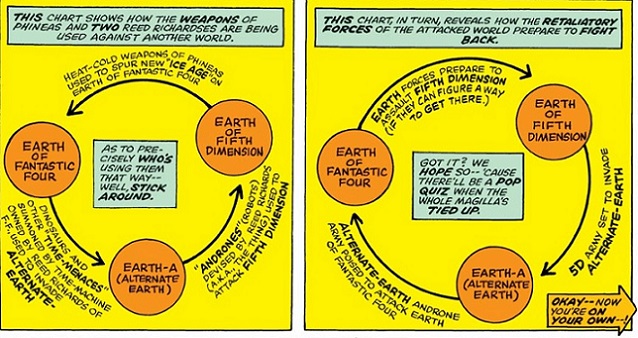 Fantastic Four I#162, p3, pan2-3 (diagrams summarizing conflicts between