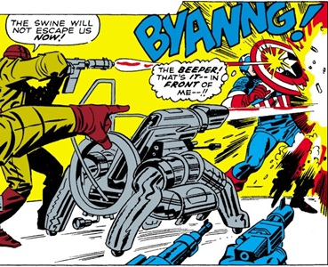 Shortly after he reached the corridor outside Chin's room, a Beeper Dog located Cap again--he fought his way past the soldiers, but was then attacked by two soldiers in an Air-Car; but before the aircraft could fire upon him, Captain America was saved by Colonel Chin, who shot the two soldiers and Cap commandeered the Air-Car.