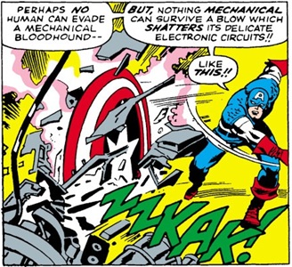 Tales of Suspense I#86/2, p7, pan2 (Beeper Dog gets destroyed by Captain America's hurled shield)