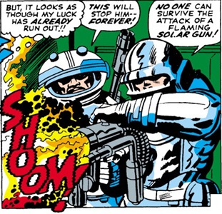 The Solar Gun was a sort of flamethrower, and it produced heat so intense that it could melt steel within a fraction of a second--the soldiers wielding it had to wear special suits for protection from the heat. Captain America managed to dodge a blast from the weapon, but while the soldiers paused to adjust its intensity, Cap performed a fast cartwheel that bowled them over. --Tales of Suspense I#86/2 |