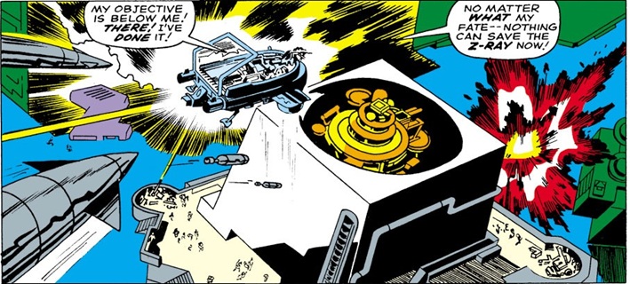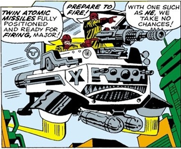 General Chou ordered the launch of interceptor missiles to destroy the intruder, but Captain America used the Air-Car's twin atomic missiles--the resulting explosion not only destroyed the Z-Ray, but also the missiles launched by Chou.