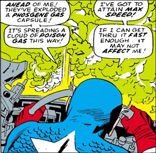 Captain America then flew the aircraft to the Z-Ray, and the soldiers fired a Phosgene gas capsule in his path, but Cap increased the Air-Car's speed and flew through the deadly cloud so fast that it didn't affect him.