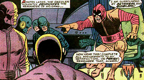 The Dazzler's gang consisted of down on their luck vagrants who were subservient to his every whim because of the special costumes he forced them to wear. Not only did they contain two way communication gear that the Dazzler could use to listen in on them, the fabric of their uniforms was also laced with chemoid particles that allowed Dazzler to track his henchmen's every move by focussing his "dazzler-beams" on the particles. If any of his gang displeased him, Dazzler could change the nature of the chemoid particles to antimatter, which ensured the wearer died instantly. In theory, these features would make his henchmen completly loyal. Dazzler's gang used specialized ray-blasters by the villain's own design and used Jet Pogo sticks for transportation.