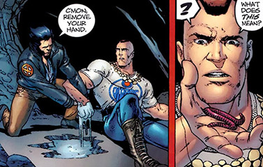 (Wolverine II#180) - Wolverine and Shaman took Chuck to Prince George, British Columbia to help him find his totem. Before handing him over to Wolverine, Shaman made sure Moss knew he himself had to choose to walk the path he was about to embark on. Moss grudgingly said he accepted, prompting Shaman to reply it shouldn't be a burden, but a gift. He added that as soon as Moss was no longer at odds with the supernatural, there would be no more occasion for fear, doubt or regret. The next day, Wolverine took Moss out to the woods where he tried to teach him the ways of the natural world, approaching a deer without startling it. Moss' unsubtle approach caused the animal to panic, hitting Wolverine in the groin with its powerful hindlegs. None the worse for wear, Logan moved on to training him in sword fighting and the samurai mindset. He also got Moss to overcome his fear of heights and the elements by making him walk over a tree trunk across a chasm, even making him do it blindfolded. In the end, Logan led Moss to the cave where he was supposed to meet his spirit animal. Moss was forced to spend the night alone in the cave. Besieged by unknown mystical forces, he managed to survive the ordeal and was found the next morning by Wolverine. When he opened his hands, Moss discovered an earthworm in his hand. Disappointed that his animal totem was a common worm, he was comforted by Wolverine who assured him this was actually a good sign: worms were earthmovers after all. Minutes later, Wolverine's hunch proved correct when he spotted Moss out in the woods petting the agressive deer that had eluded them earlier.