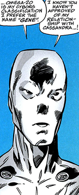 Powers/Abilities: Prior to his voluntary transformation into a cyborg, Gene possessed no known superhuman abilities. As a cyborg, he underwent radical genetic alteration for life in deep space. Designated Omega-20, Gene could operate in the vacuum of space without any form of life support or protective suit. Despite the fact he gave up much of his humanity, Gene still preferred to be called by his birth name and apparently had a full range of emotions, falling in love with historian Cassandra Locke.