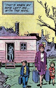 Sam Burgh was a happily married man, enjoying the bliss of suburbia with his wife and two children. However, after the Hulk tore through the town while fighting the military, the community fell apart. Even though they got an emergency trailer to stay at, Burgh turned to drinking and soon forced his wife to leave with their young children for parts unknown.
