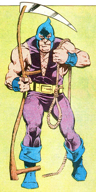 (Werewolf By Night I#11 (fb) - BTS) - Harlan went underground and created the costumed identity of the Hangman, using a reaping scythe and a hangman's noose to kill any man he deemed corrupted by evil. He also constructed the lair of the Hangman, a small prison complex in an old, abandoned building where he locked up a number of women he'd kidnapped so he could protect them from all the evil and corruption of the outside world.