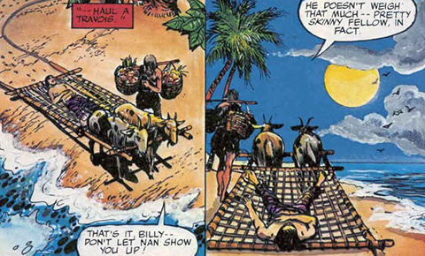 Hatcher found two oxen type beasts he called Billy and Nan when he first arrived on "Paradise Island". Managing to gain their trust and confidence, he slowly but surely domesticated them to the point he could use them as beasts of burden. Hatcher used Nan's milk to live off and managed to weave both their thick, furry coats into protective gear. He also created primitive but functional harnesses that allowed the two beasts of burden to carry whatever bounty he'd managed to forage from the jungle.