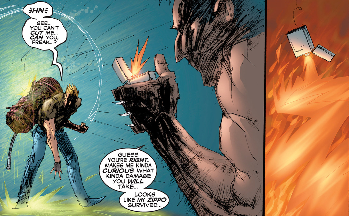 (Uncanny X-Men I#398) - Mister Clean tracked down one of the final surviving groups of Tunnel Dwellers who were under the X-Men's protection. Surprised to see the X-Men he had defeated were still alive, Clean was excited to get another go. However, Iceman closed off the tunnel with an ice wall that protected the Dwellers while trapping Clean in a corner of the tunnel with Wolverine. The genetic cleanser was unfamiliar with the feral mutant and simply set him on fire while tossing a grenade at his burning form to finish him off. Turning his attention to Iceman's barrier, Clean was shocked when Wolverine almost immediately recovered and was ready for round two. When he proved unable to pierce Clean's skin with his claws, the experienced fighter instead clawed at the gasoline tank Clean carried on his back to fuel his flamethrower. With Clean soaked in the highly flammable solution, Wolverine decided to turn the tables and lit the genetic cleanser on fire using his lighter. Mister Clean died in the fire, as Angel also saw Mister Clean's signal disappear on his tracker.