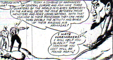(Comedy Comics#10) - Monstro emerged from the Atlantic and waded ashore in New England, where, still in a daze, he inadvertently left a trail of destruction in his wake as he accidentally snapped the tops off mountains, swamped boats and demolished buildings by brushing against them. With panic overtaking the Eastern seaboard, the army was sent in, but anti-aircraft shells proved to be no more than itching powder to him, and he swatted fighter squadrons out of the air like flies, but only because they opened fire on him. However, he was genuinely concerned that he wasn't popular with the locals, as they were running away from him, and so when he spotted Major Crash's airplane he hoped it wouldn't shoot at him too. When they didn't open fire, he decided to try and catch the plane without crushing it, and explained his origins to those within, but while he was recounting his tale, Major Crash's prisoner, the Axis spy Little Poison, escaped with a valuable decoder device. Crash tried to enlist Monstro's help in recapturing her, but the giant initially declined, insisting he was through with war, but Crash swiftly convinced him that if the Axis were warmongers while their opponents were peace-loving nations, and that if decoder fell into Axis hands it would be disastrous. Monstro used his powerful eyesight to spot the fleeing spy, and released Crash's plane so he could glide it down to the ground in pursuit. When it instead dropped like a stone, Monstro's fast reflexes came to the rescue and he caught it again and set them down safely. Crash and Hook battled Little Poison's Nazi allies, and when Little Poison tried to flee with the decoder, Hook signalled Monstro, who blocked her escape with one giant hand. After handing the spy over to Major Crash, Monstro strode off for parts unknown.