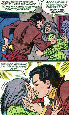 (Amazing Spider-Man I#174) - Carefully making his way home as Spider-Man following a fight against the Molten Man, Peter tried to sneak into his apartment when Mrs. Muggins suddenly opened the window and, unthinkingly, tossed out a bucket of filthy ammonia water. Drenched, Peter remembered this was Mamie's cleaning day. Keeping himself hidden until she finished up and left, the reeking Peter made his way inside, happy that at least he wasn't noticed by his landlady.