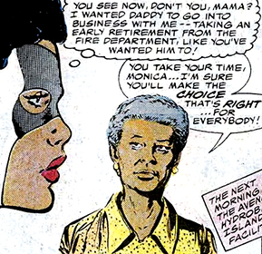 (Avengers III#27) - When Captain America tried to contact Monica Rambeau on her communicard to see if she'd be interested in returning to active duty, her mother Maria answered instead. She frantically pleaded with Cap not to ask her daughter because she'd agree to come back. This would leave Frank alone in the business they'd just started and with him not in the best of health, Maria figured they couldn't afford it if Monica wound up stuck on the wrong side of the galaxy again.