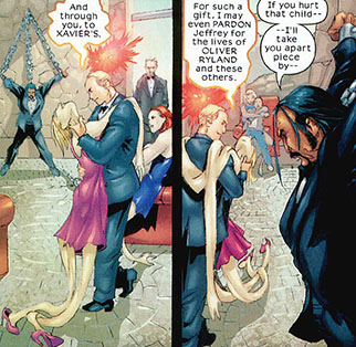 (X-Treme X-Men I#22) - Unbeknownst to anyone, the malevolent psychic entity known as Elias Bogan mind controlled Emma Frost and took over her body in order to check on Garrett who was staying in the students' sleeping quarters. While monitoring the students' dreams "Emma" noticed that the handsome Jeffrey had charmed Rubber Maid, who was dreaming about him. Bogan found himself opposed by Storm, the fight that ensued woke up Rubber Maid and the others. The panic among the student body increased even more when Bishop and Sage arrived to try and apprehend Jeffrey Garrett. Acting on Bogan's orders, Garrett teleported all mutants present to the Danger Room where an interactive, unrestricted holographic program was running that replayed events that led up to the Alaska murders.