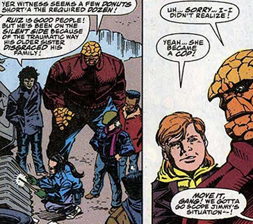 Fantastic Four I#361, p16, pans4&5 (disgraced because sister became a cop)