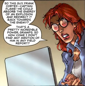 (All-Winners Squad: Band of Heroes#1) - On a rainy day, Alyssa accompanied her grandfather when he made his annual visit to his "cousin" Piotr's grave. When they got back to his home, Bill Bryon decided it was time to reveal his secrets to Alyssa, so he had her follow him to a locked room, where he secretly kept war memorabilia and a collection of old Timely comic books; he gave her a handful of the comics, including a very special one--the first issue of Super Hero Comics, with the first (and only) Captain Flame story. Bill insisted that Alyssa read the old books first, then he would give her the interview she always wanted. As Bill went to bed, Alyssa sat and read the old comics throughout the rainy night--she took a short break and looked out a window, but unknown to her, a shadowy figure was lurking outside (see comments).