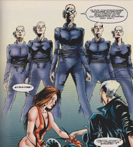 (Midnight Sons Unlimited#8 - BTS) - Blade threatened to kill Dro if he didn't smuggle him on board the Clave's mothership. Dro complied. Meanwhile Aleph's preliminary evaluation of Strange revealed that Strange was the progenitor of the Kynd.