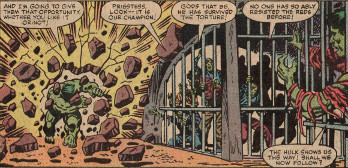 Breaking free, the Hulk smashed his way into and shattered the Greens' dungeons.