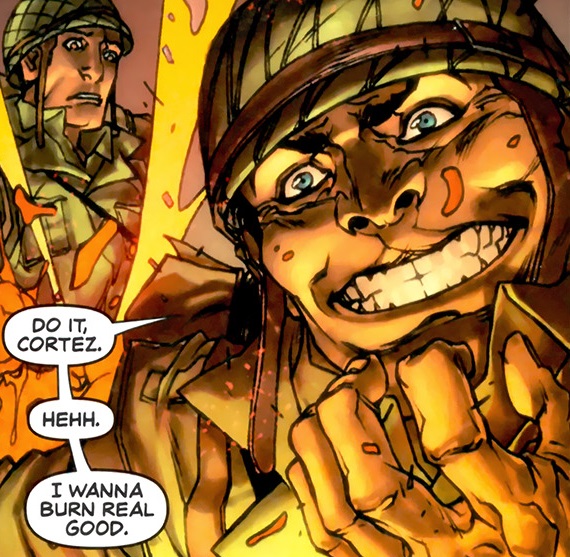 All-Winners Squad: Band of Heroes#3, p18, pan4 (Davey Drew wants Captain Flame to burn him real good; "Jap-Buster" Johnson (background))