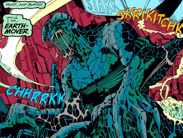 (Iron Man I#298) - Tony Stark was alerted to the situation at the Acheron Mountain Geothermal Research Facility. Using his neural telepresence armor (Tony Stark was at this time recovering after having undergone treatment for a techno-organic parasite), he investigated the damaged facility. Coming across Earth-Mover, Tony Stark assumed the creature was the reason for the emergency. Although Earth-Mover still possessed the intellect and faculties of Dr. Stone, he was unable at that time to clearly vocalize his thoughts to explain his presence. Tony Stark used his armor to attack Earth-Mover, and a battle ensued, with Earth-Mover able to hold his own against Stark's remote-controlled armor. Earth-Mover was finally able to utter a few words, asking Iron Man to stop his attack, but their battle was interrupted by Ultimo.