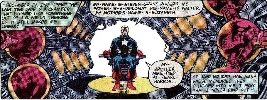 Steve Rogers was seated in the chamber (which he thought looked like something from the writings of H.G. Wells); he spent three days undergoing the procedure (see comments), and the false memories were successfully implanted into his mind. Although Steve didn't know how many false memories were programmed into him (and he prayed he never found out), some of them included the personal "facts" that his middle name was Grant (he actually didn't have a middle name), his father Walter was a diplomat, his mother was named Elizabeth, and his brother Mike died at Pearl Harbor.