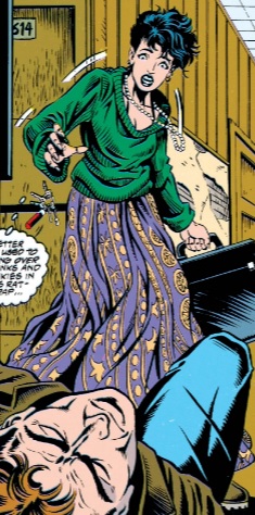 (Web of Spider-Man I#119) - Greer found her next-door neighbor, Ben Reilly, collapsed in the hallway, bleeding from an abdominal wound (which he'd incurred at the claws of Venom as the Scarlet Spider). Introducing herself, she helped him to his feet and took him to a nearby clinic, where they stitched him up. Later, she knocked on his door to check up on him; he insisted that he was fine, but that he was in the middle of something and couldn't talk.