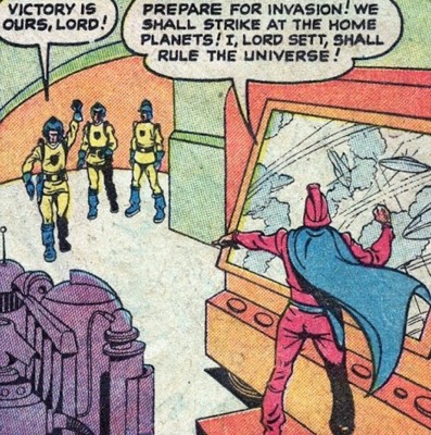 History: (Journey into Unknown Worlds I#37/2 (fb) - BTS) - The past of Lord Sett is unrevealed, but he eventually became the dictator of his planet. Considering himself to be the greatest of all, Sett decided he should therefore rule all, and his lust for power drove him to extend his dictatorship throughout the galaxy. He dispatched a scout ship to deliver a challenge of battle to his opponents, the forces of the Galaxy Command.