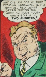 Meanwhile, in the main signal station of the subway, Goderich von Blubber and his two henchmen took control of the public-transportation facility. The Nazi agents planned to sabotage the train signals in the early morning rush hour to cause all the subway cars to collide.