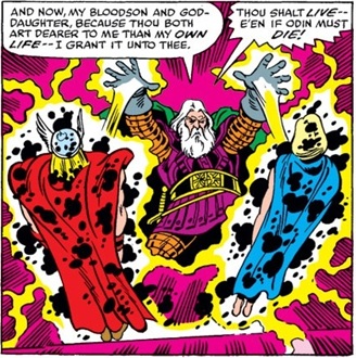 Thor I#300, p6, pan8 (Siegfried gets reincarnated as Thor; Odin [background], Brunnhile [left])