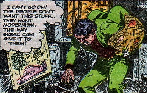 That night, Andre returned to his studio to work on a painting, but he became angry when he realized that no one wanted to buy his works, because everyone seemed to be enamored by Skrak's style of modernism. In a fit of rage, Andre destroyed all his paintings, and he became determined to learn Skrak's secret at any cost.