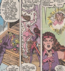 (Dazzler I#3 (fb) - BTS) - At some point, the peculiar sorcerous properties of the gems caused them to become adrift in time and space. One of them eventually ended up in a dimension quite near Reality-616.