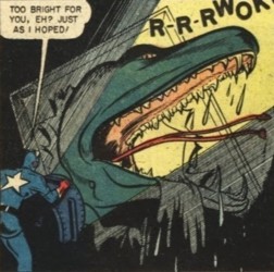 Marvel Mystery Comics I#91/4, p4, pan4 (Headshot - Captain America shines spotlight at Tyranno)