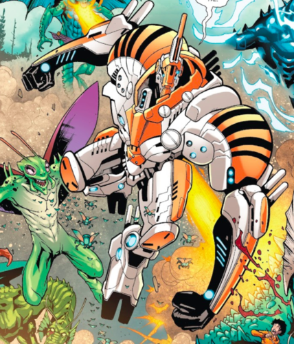 Some of the details about Aegis were revealed initially in an interview by Cullen Bunn about the Monsters Unleashed event. Aegis may have an origin prior to being summoned by Kei Kawade, or he may be an original creation by Kei. Aegis reminds me of a skyscraper and a Transformer at the same time. Aegis has an enthusiastic personality and he nerds out over monsters and super heroes. He loves punching, sharks, and action, and he hates being bored. He sometimes considers himself the leader of the monsters team.