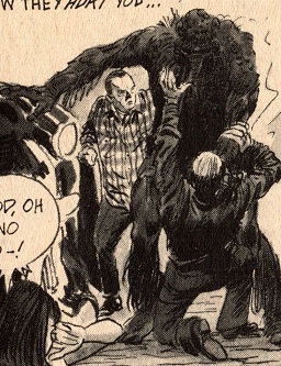 (Savage Tales I#1) - Despite its distorted perceptions and memory, the Man-Thing traveled back to the road and intercepted their car. Alan's associate slammed on the brakes to avoid a collision, after which the Man-Thing grabbed Alan and burnt his face and/or strangled him (regardless leaving him incapacitated on the ground), after which it picked Alan's associate over its head and then broke his back of its knee. The Man-Thing further burned and scarred Ellen's face before wandering off.