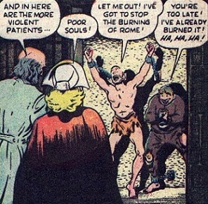 But one day, while Brimm was out on a call, Nurse Bryant went to Thorn's cell and asked the wild-eyed madman to tell her about his encounter with the "four-armed men". After Thorn related his tale to her, Dr. Brimm entered Thorn's cell and pointed a gun at the nurse--Brimm explained that he knew Thorn's story was true...and hinted that he also knew something else (...apparently, Brimm had somehow discovered Nurse Bryant's secret). But the nurse pulled her own revolver from her pocket and shot Brimm dead. Thorn was elated after Brimm had been killed, and he told Nurse Bryant that now they could warn the world about the "four-armed men". But suddenly, the nurse turned and fired her gun again, and her next bullet entered Thorn's heart.