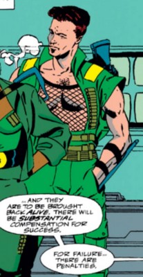 (Silver Sable and the Wild Pack#11) - The Wild Pack, including Crippler, donned diving gear and interfaced with Stingray underwater, planning a siege on a Hydra base. Soon, they were engaged in an underwater battle with Genesis Coalition agents and Cyberwarriors, then took the fight into the base. Sandman brought a second team to aid them, the Next Wave (Agent X, Fin, Snare, Turk), who were actually hired by Hydra to reclaim the Genesis Coalition's base for Hydra.