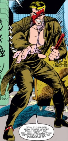(Daredevil Annual I#8/3) - Crippler found the Wild Boys committing an assault in an alleyway. Jet tossed a knife at Crippler, but he caught it and it made his hand bleed; he drank the blood to scare the Wild Boys. Crippler used battle staves and a flamethrower against the Wild Boys, then he chased them into a subway car, badly beating both of them and telling them he wanted to remember the pain and fear.