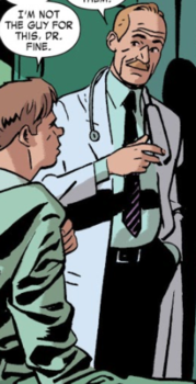 (Amazing Spider-Man I#544 (fb) - BTS) - Years ago, Dr. Fine's uncle was saved from an accident by Spider-Man. Dr. Fine promised to help Spidey if he ever could. (Amazing Spider-Man I#544) - When "May Morgan" (Aunt May) was brought in for cancer treatment with no identification or insurance, Dr. Fine explained to her nephew "Peter Morgan" (secretly Peter Parker) and his wife (secretly Mary Jane Watson) that the hospital needed resources. Peter rushed out to get help and Fine recognized him as Spider-Man from the local papers. Fine promised Peter he would do whatever he could. Later, Edwin Jarvis informed Fine that two million dollars had been transferred for May's care, but Fine had to tell Peter that his aunt was almost assuredly going to die. (Daredevil III#26/2) - Dr. Fine treated Foggy Nelson for cancer. He convinced Foggy to read to the sick kids in the ward, though Foggy was initially nervous. After reading the kids' story about fighting a cancer-dinosaur, the Disintegrosaurus, Foggy stood with Fine while Iron Man visited the kids. --Amazing Spider-Man I#544 ([Amazing Spider-Man I#544 (fb)], 544, Daredevil III#26/2 |