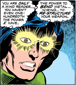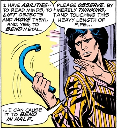 And it should be noted that Marvel used a bit of artistic license with their exaggerated portrayal of this character's powers--the real Uri Geller's eyes didn't glow, and I don't remember him ever bending any metal objects thicker than keys.--Ron Fredricks