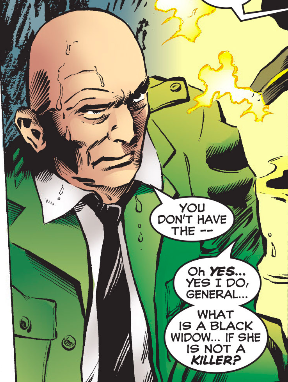 (Daredevil I#369) - Seeing news footage that the Black Widow had shot Daredevil, General Tskarov was intrigued. Davidoff stated that the Widow was the perfect operative, and Tskarov was intrigued by the possibility, asking her to be brought to him. Tskarov checked on Darkstar, then met with Black Widow, brought to him by Davidoff, and Tskarov questioned her about her recent history. Ursa Major and Vanguard apprehended the wounded Daredevil, who had followed Black Widow there, and Tskarov had him tied up in the basement. Davidoff worried that Black Widow was faking, but Tskarov said he knew how to handle her.